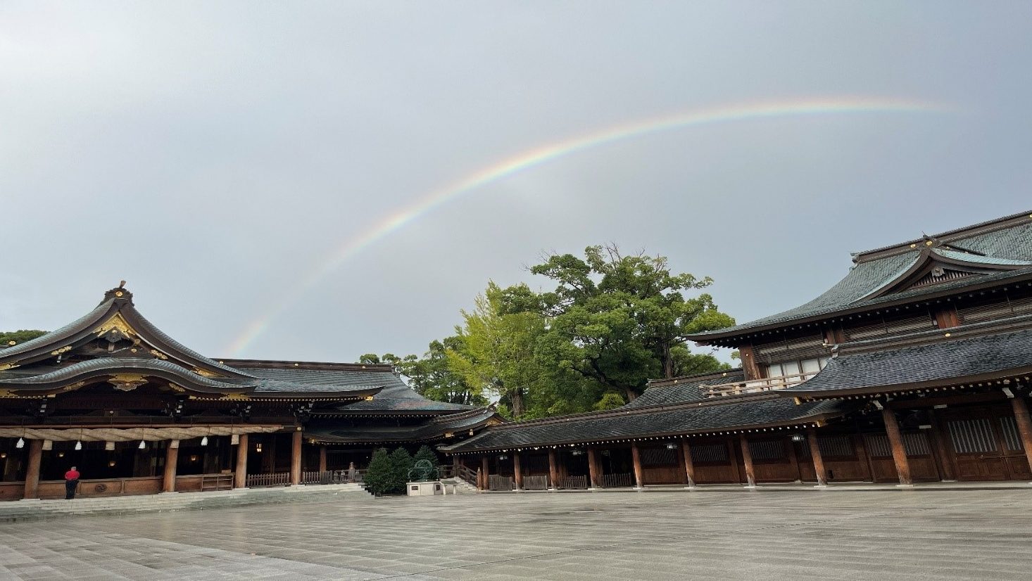 10月1日16時30分寒川神社に専務と参拝。神社の門をくぐった時に、社殿の向こうに虹が架かっていました。