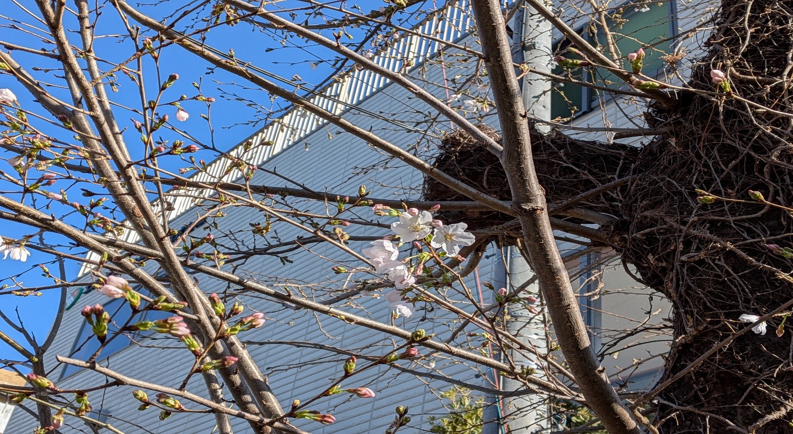 会社の隣に咲き始めた桜。(2026年3月24日撮影)1週間後には、ほぼ満開に咲いているのではないでしょうか。
